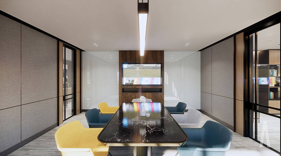 The micro concept which then led us to the visual cues or design elements for the interior was broken down into a few key points, extracted from the company's logo philosophy and symbolisms. Hence in the design, we see the use of leaves-shaped ornaments in the wall arts, representing growth and strong foundation of a sturdy tree, with the color scheme consisting of blue (comfort, calm), golden yellow (prosperity, glory), and dark blue (honor, trustworthiness) with a monochromatic palette as the base.