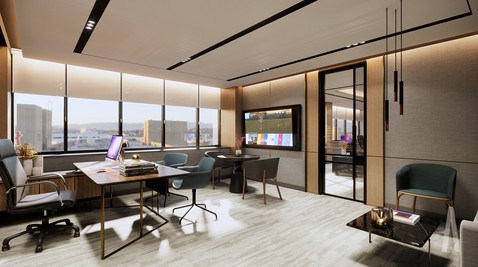 The area that we designed includes the reception, main coworking space, conference rooms, as well as the commissioners' and directors' offices. As seen in the picture, the design reflects an elegant and contemporary atmosphere, with a sleek yet warm look. The combination of shapes, linings, and materials used across the interior also enhance the dynamism throughout the office. For information regarding transforming your company and its values into the form of a professionally well-designed office, contact us directly through the e-mail address business@aliendc.com.